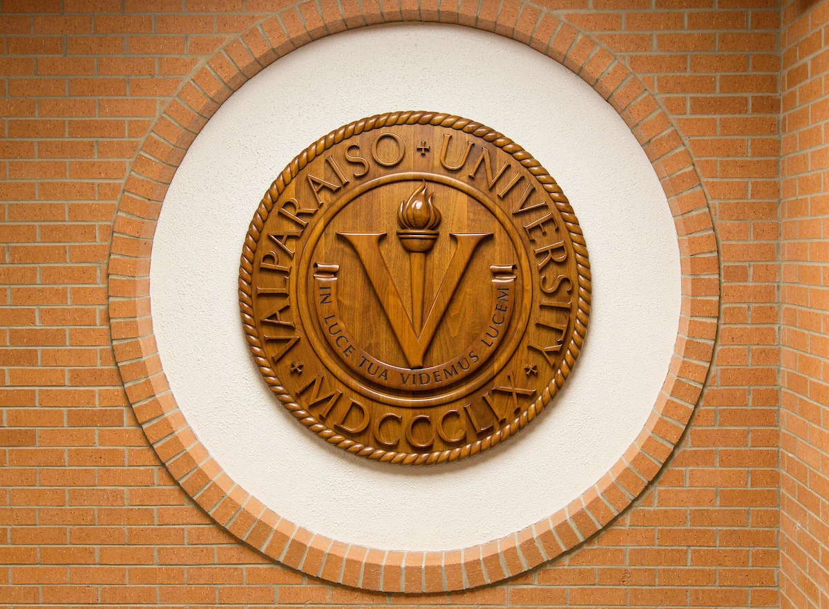 Large gold Valparaiso University seal with a torch, "1859," and Latin motto displayed on a round plaque in the President's Office.