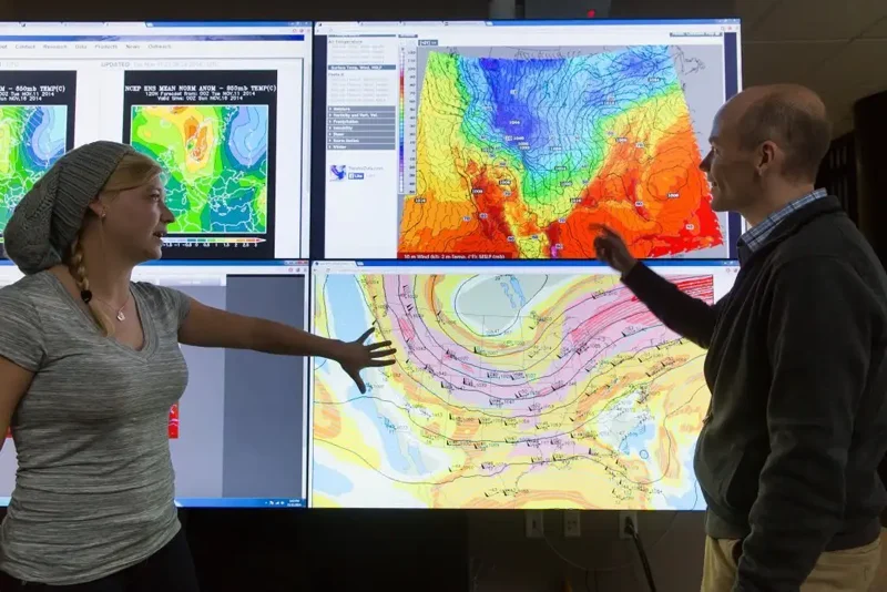 The department’s home is in Kallay-Christopher Hall, an award-winning facility that signals its connection to the weather and the world around it with its strikingly angled wall of windows. It is connected by a glass walkway to Schnabel Hall, which houses a geographic applications lab as well as television and digital media studios used by students exploring a career in broadcast meteorology.