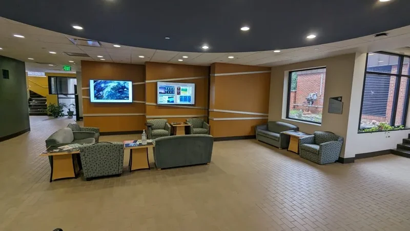 An area adjacent to the Weather Center on the second floor of Kallay-Christopher Hall provides a welcoming environment for students, featuring a wall-sized map of the world, a white board for study review and a mobile VisBox wall-sized monitor for dynamic display of weather maps.