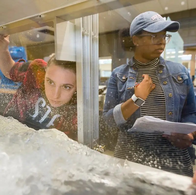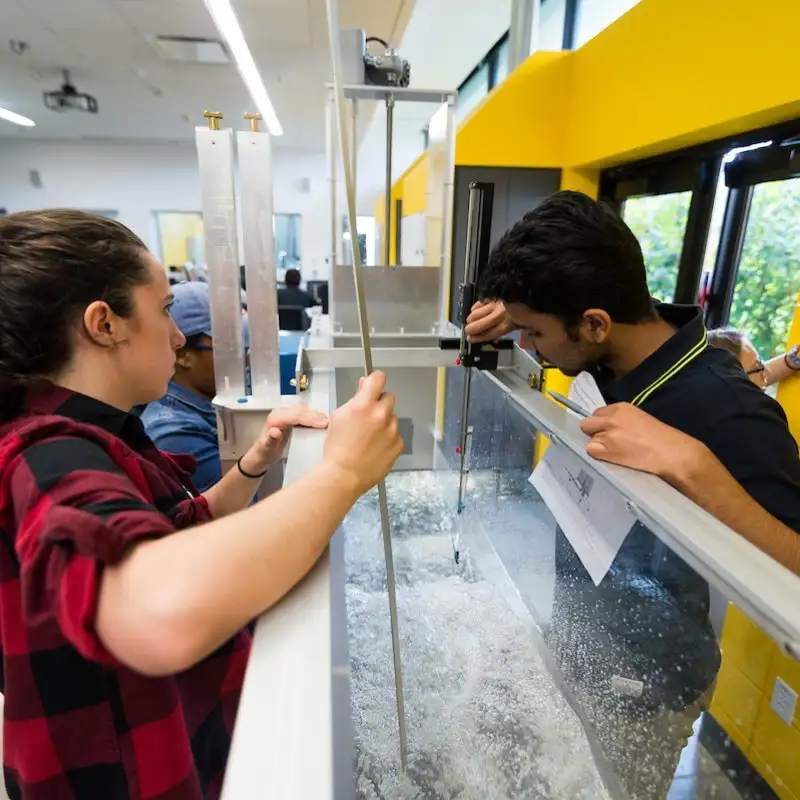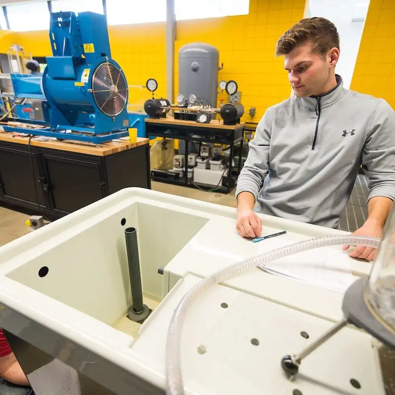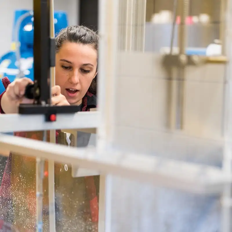 The fluid mechanics lab is used to study concepts covered in fluid mechanics class. Topics include flow in open channels such as rivers, flow in closed conduits such as pipes, groundwater flow, hydrostatic forces, hydropower generation, pumps, flow measurement, and drag forces, among other topics. Laboratory experiments give students hands-on experience with concepts used to solve practical engineering problems.