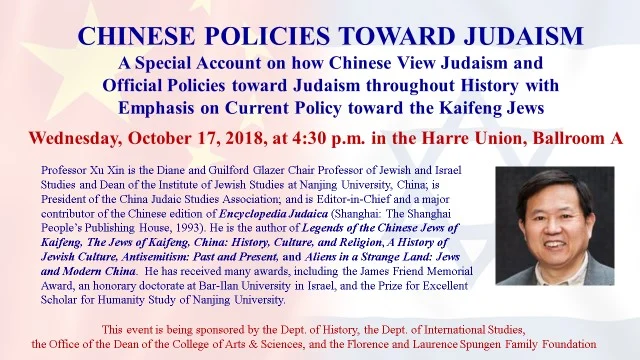 Event flyer for a Valpo lecture on Chinese policies toward Judaism, featuring a photo of guest speaker Professor Xu Xin.