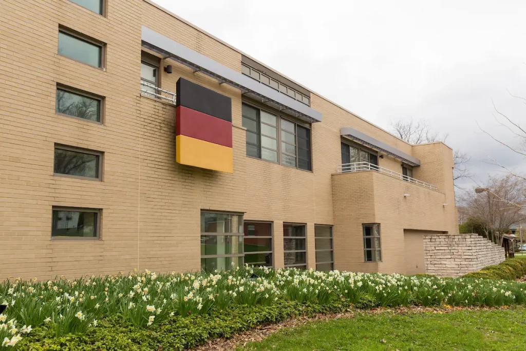 Kade-Dusenberg German House is a co-ed residence hall that has a capacity for 13 students. Residents of Kade study German language and culture through a partnership between Foreign Languages and Residential Life. This hall is unique in that the German language must be spoken at all times in the public areas of the facility, such as the kitchen and lounges, in order to promote immersion and learning. Kade is a suite style hall with two, three and four-person suites. Residents live in double rooms that are equipped with movable furniture including beds, wardrobes, desks with chairs, bookshelves and dressers. Each suite has shared bathroom spaces within.